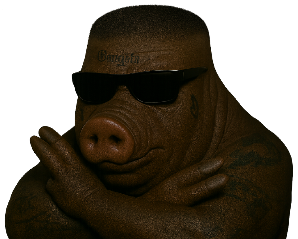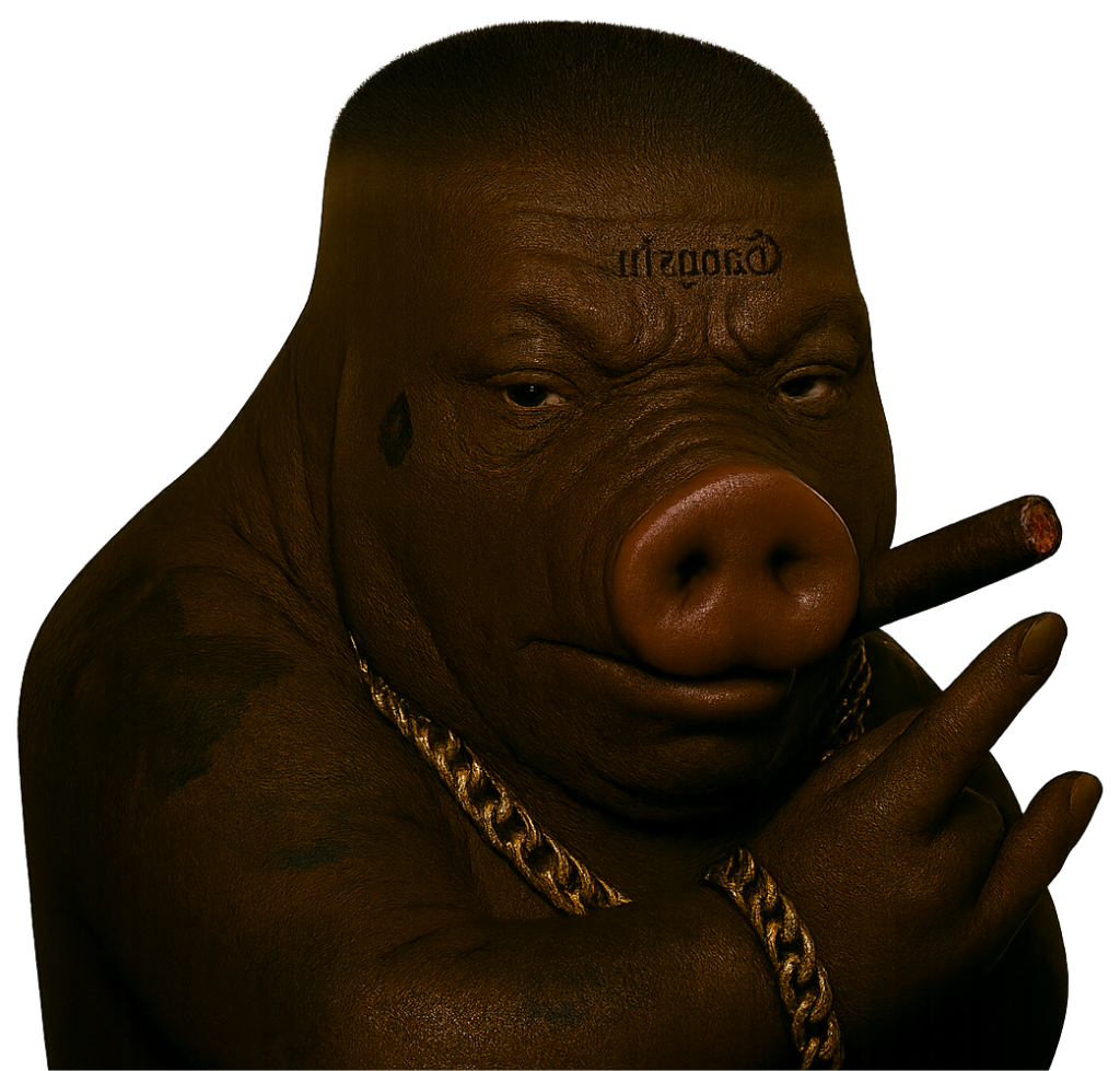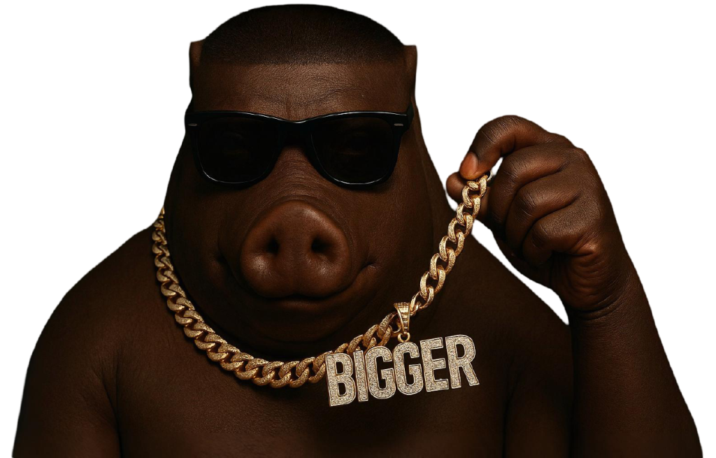 Black Pigger grew up in chaos, powered by smoke, gold, and pure attitude. A rough-edged beast with a hunger for dominance, moving through the world with heavy swagger. No fear, no mercy—just the $BIGGER way of life.